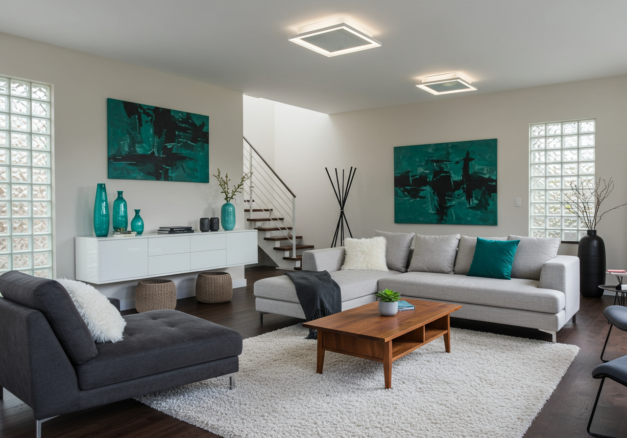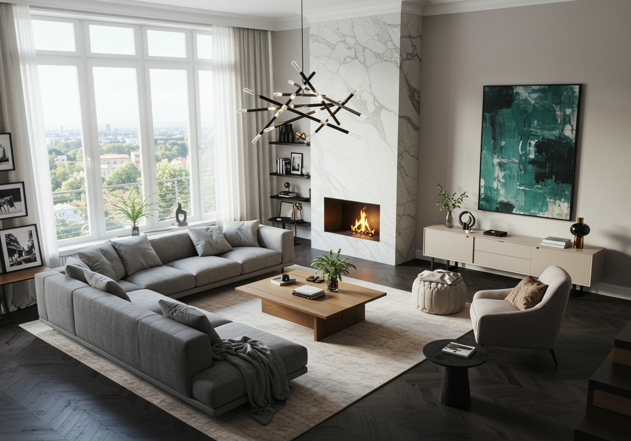 The living room boasts impressive 15-foot-high ceilings, a wood-burning fireplace, and a wall of double windows with custom remote-controlled blinds overlooking the terrace.