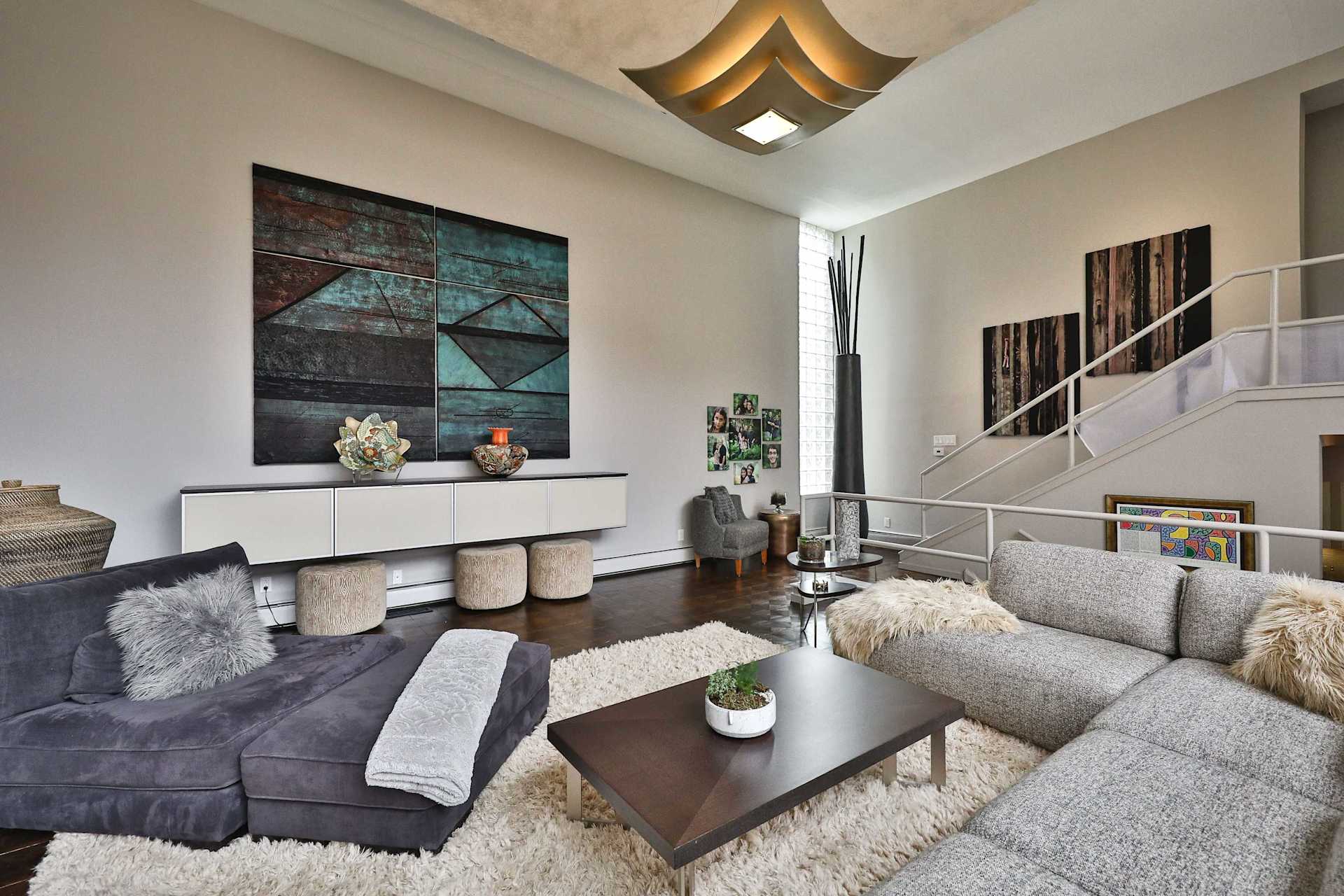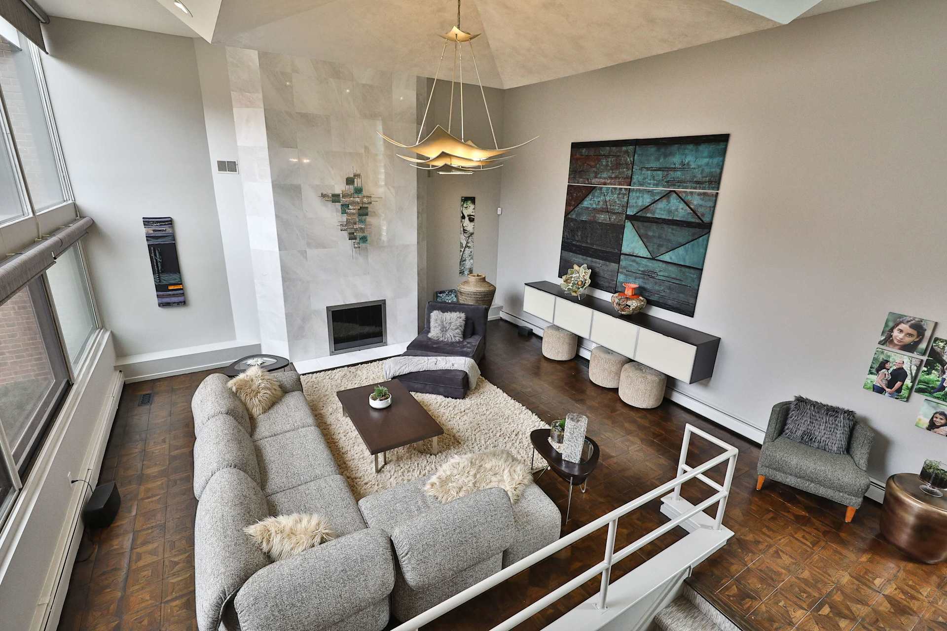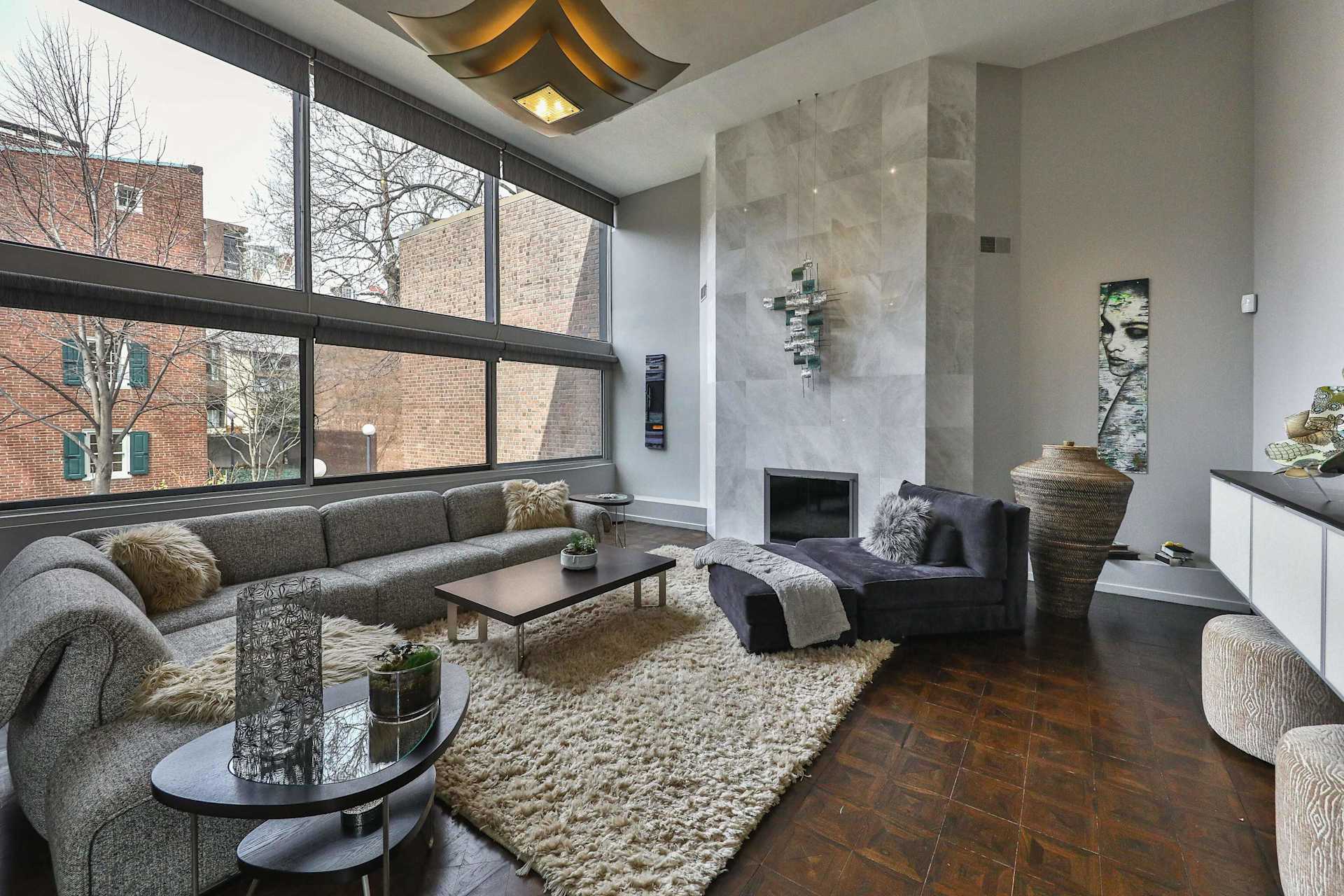 The living room boasts impressive 15-foot-high ceilings, a wood-burning fireplace, and a wall of double windows with custom remote-controlled blinds overlooking the terrace.