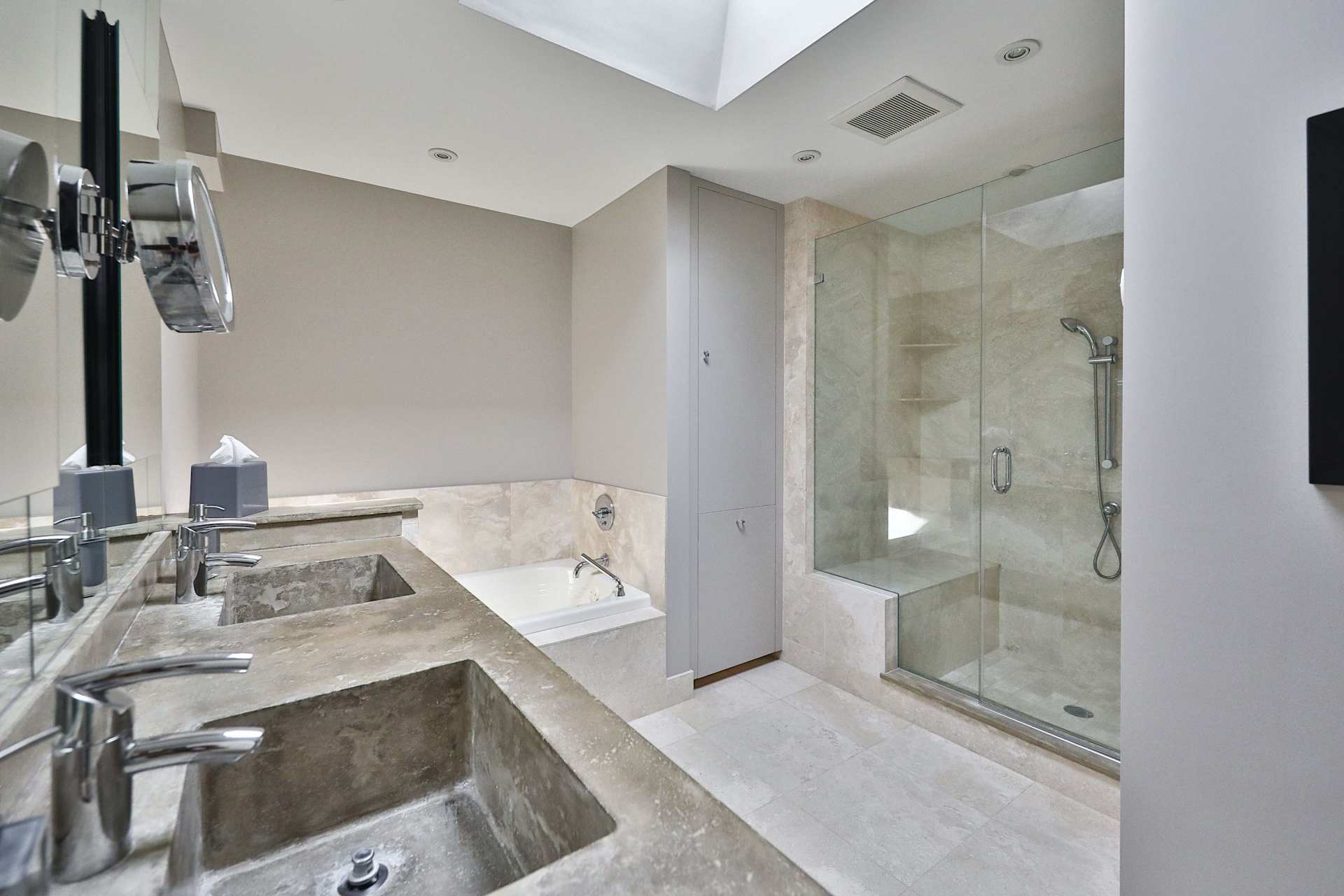 The upper level of the home hosts the primary bedroom suite with two spacious closets, ensuite spa-like bathroom with heated marble floors, walk-in shower, deep soaking Jacuzzi tub and double sinks.
